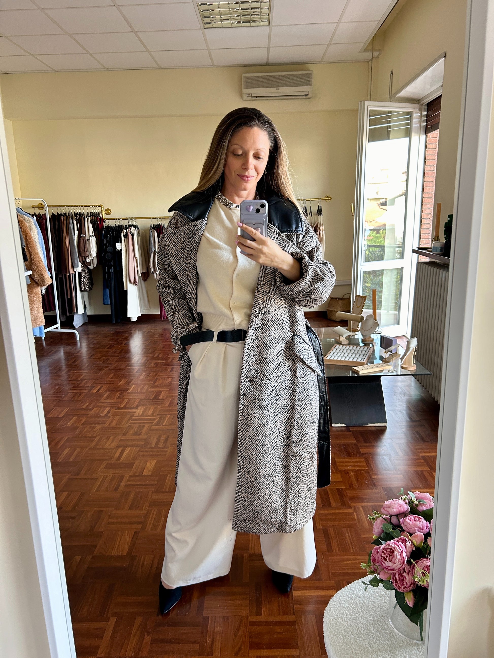 Cappotto in tessuto a spiga con dettagli in ecopelle sul collo e cinta.