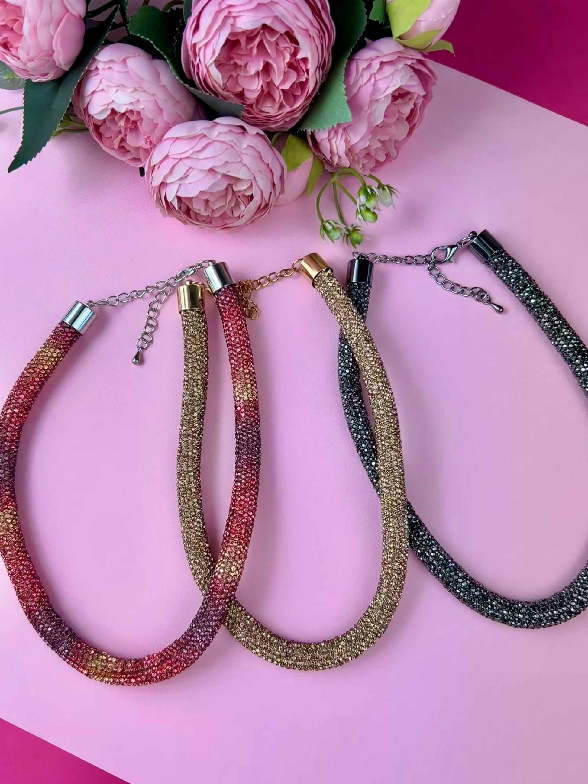 Collana scintillante, disponibile in tre varianti di colore: antracite, tramonto e oro.