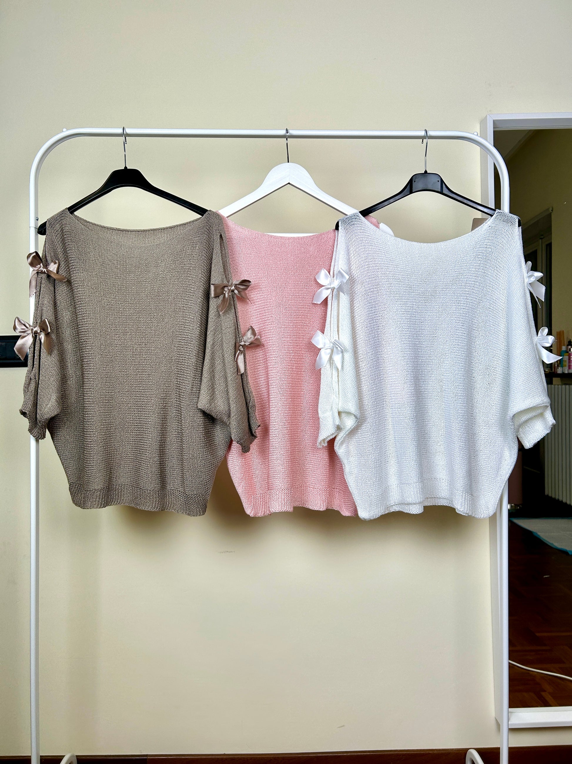 Maglia con fiocchi laterali in rosa, tortora e bianco, taglia unica.