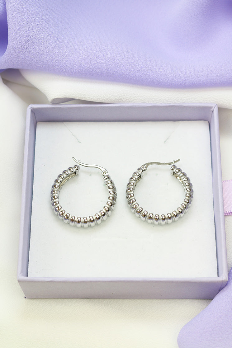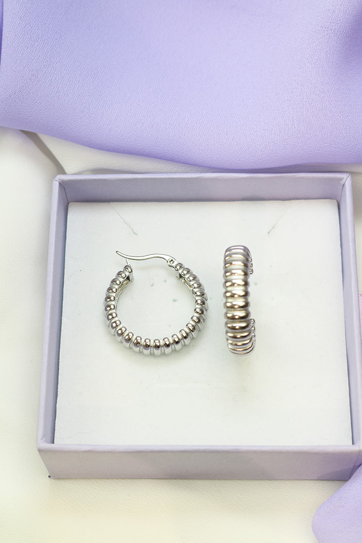 Orecchini a cerchio in acciaio inossidabile con lavorazione in rilievo.