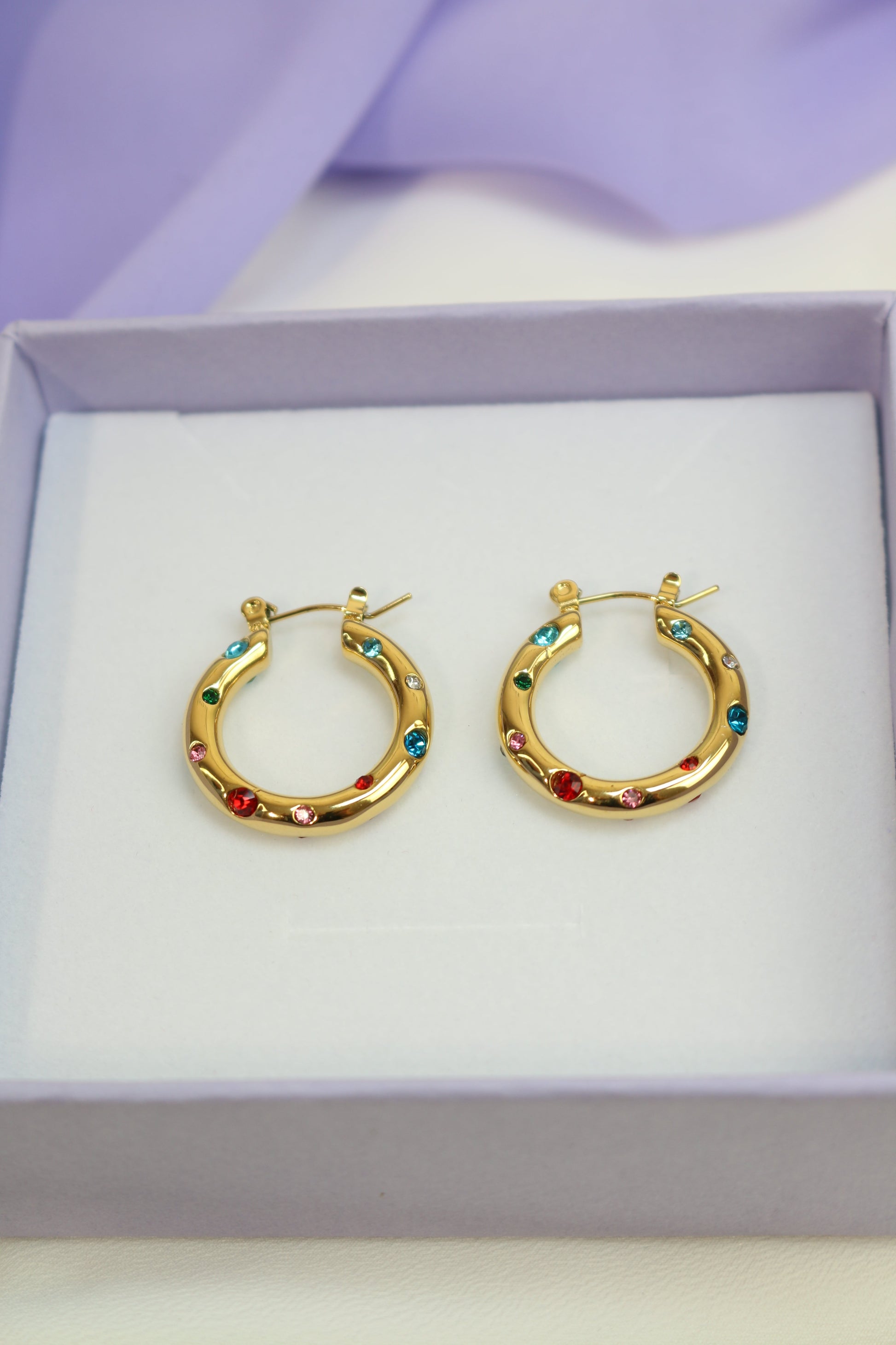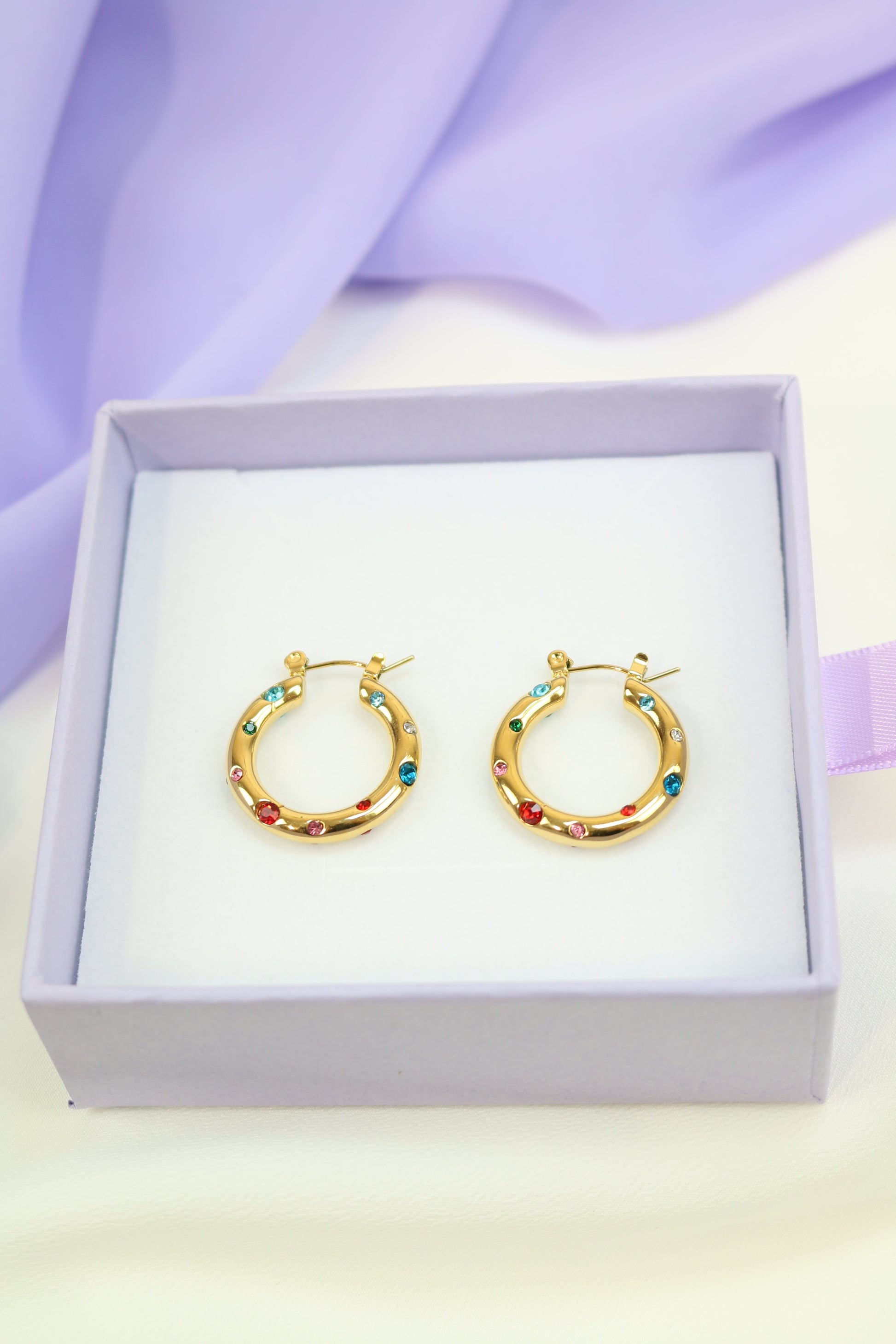 Orecchini in acciaio inossidabile, a cerchio con zirconi multicolor.