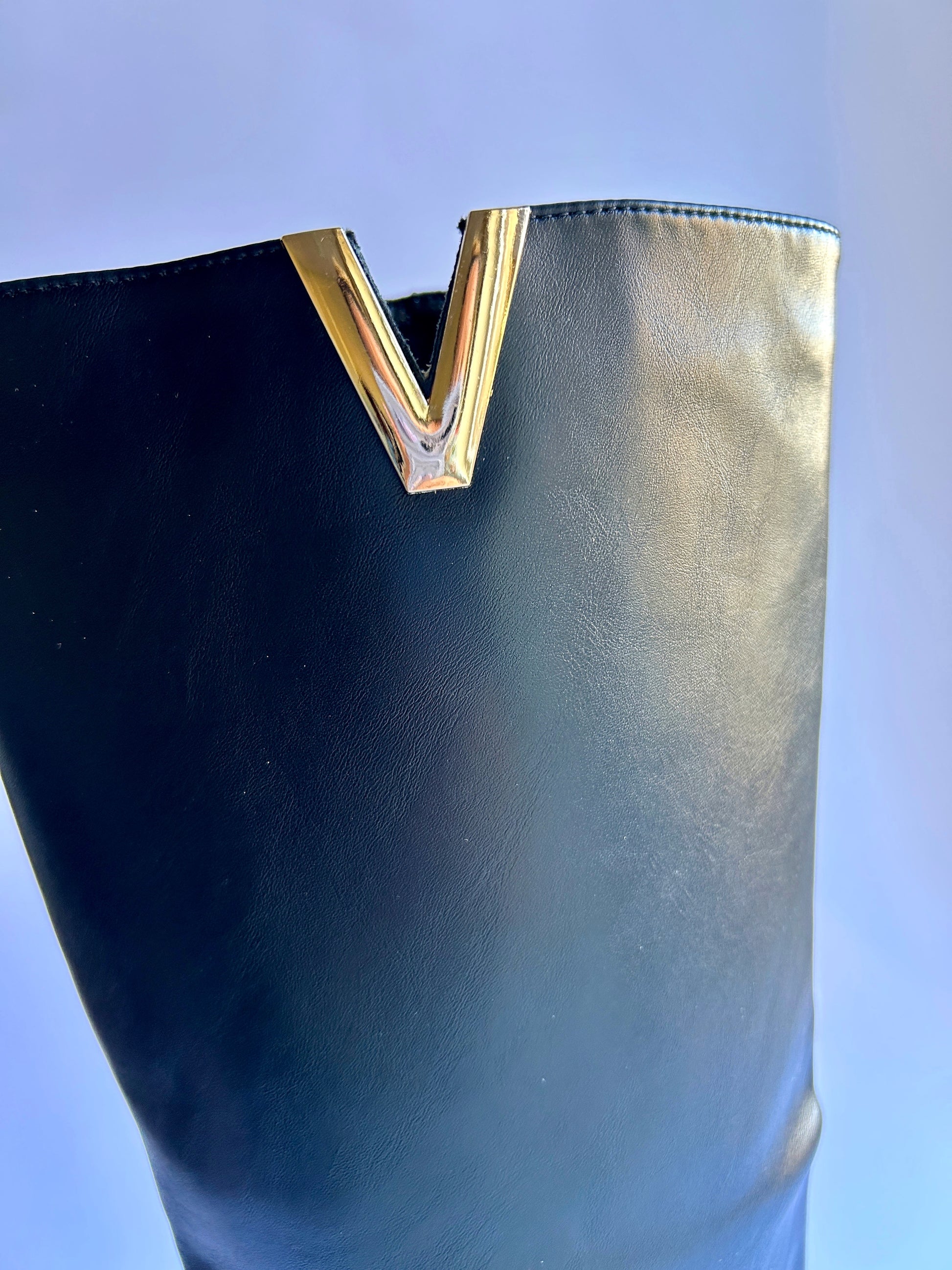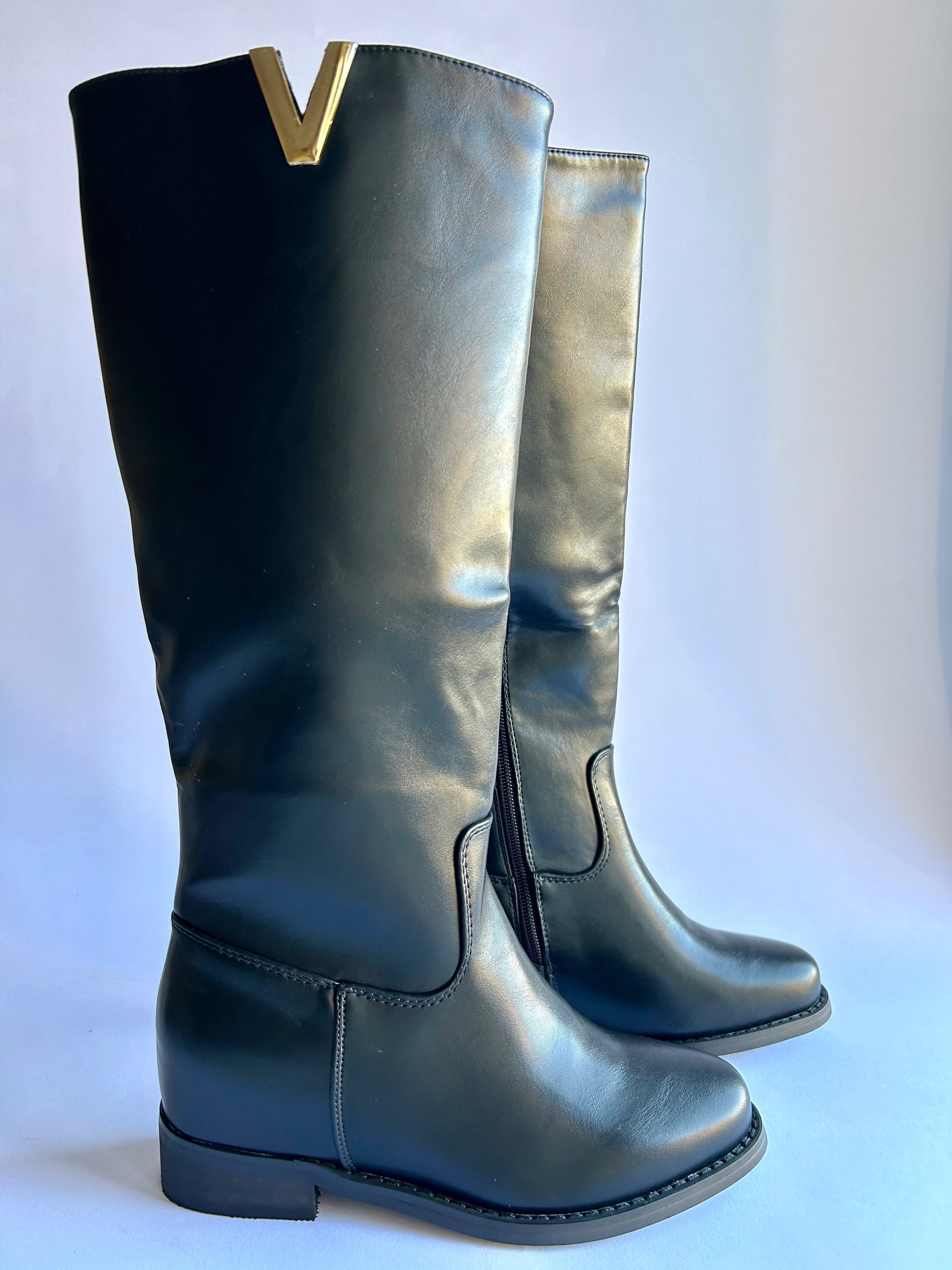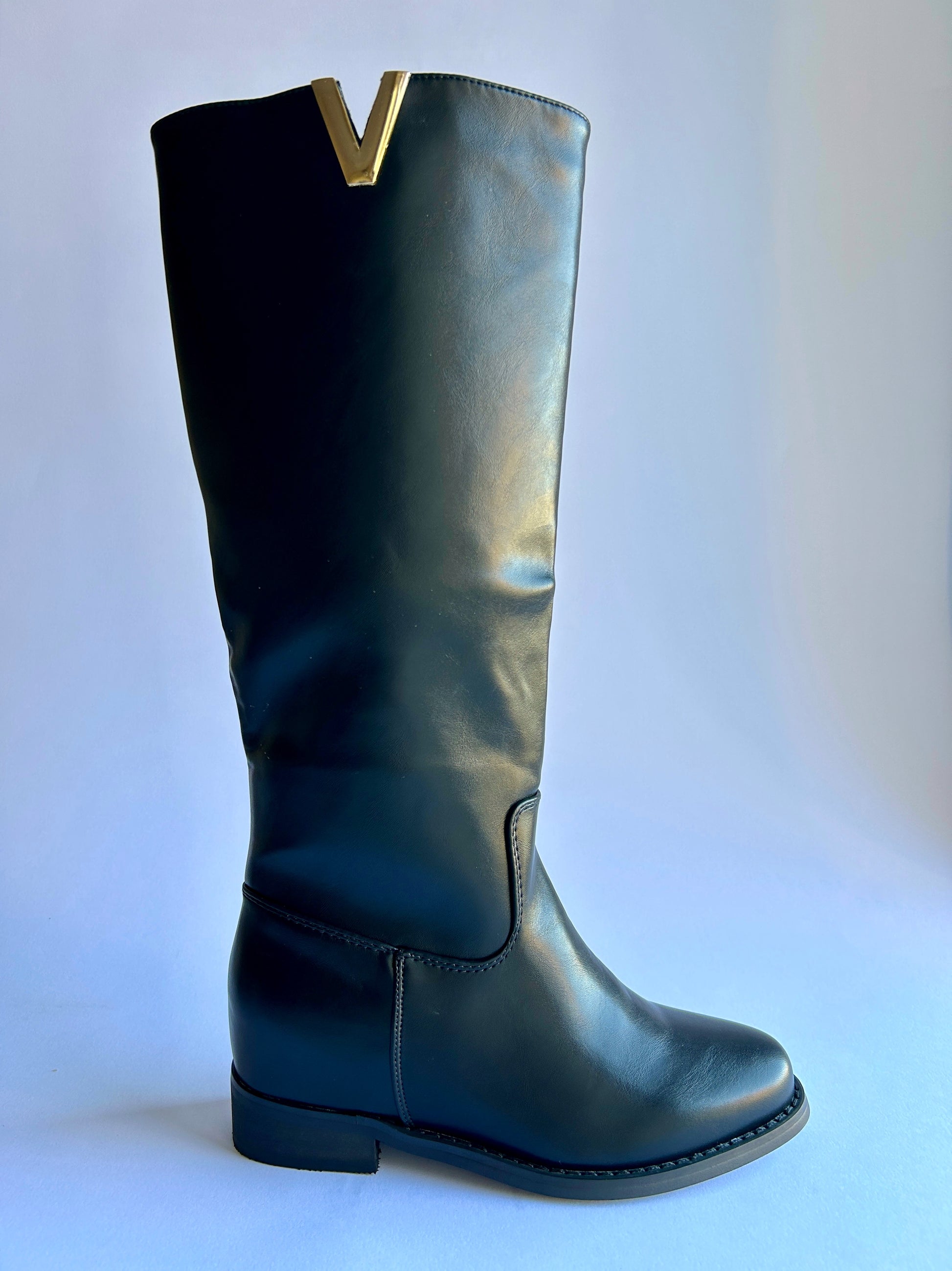 Stivali neri bassi con zip e dettagli V in oro.