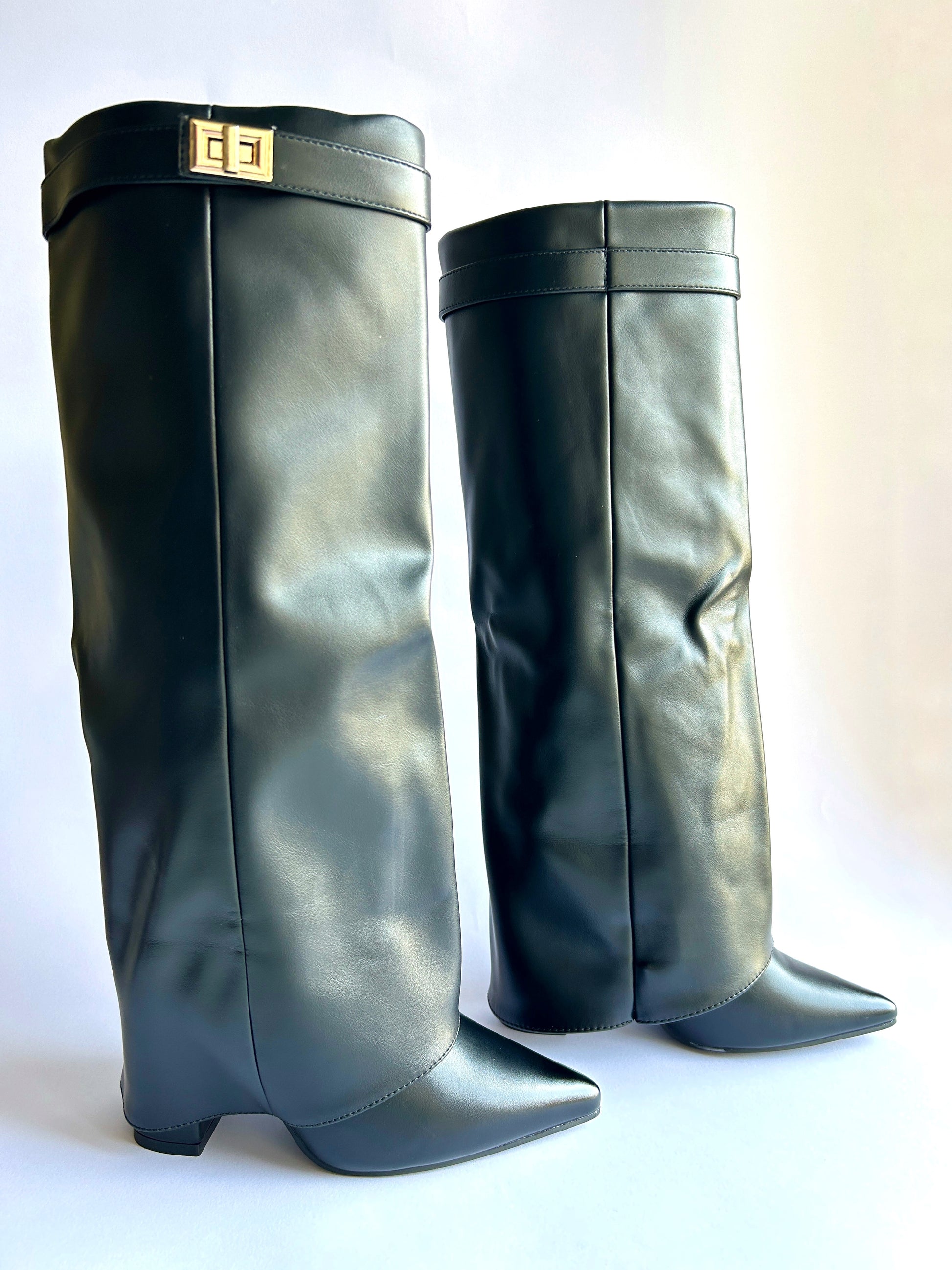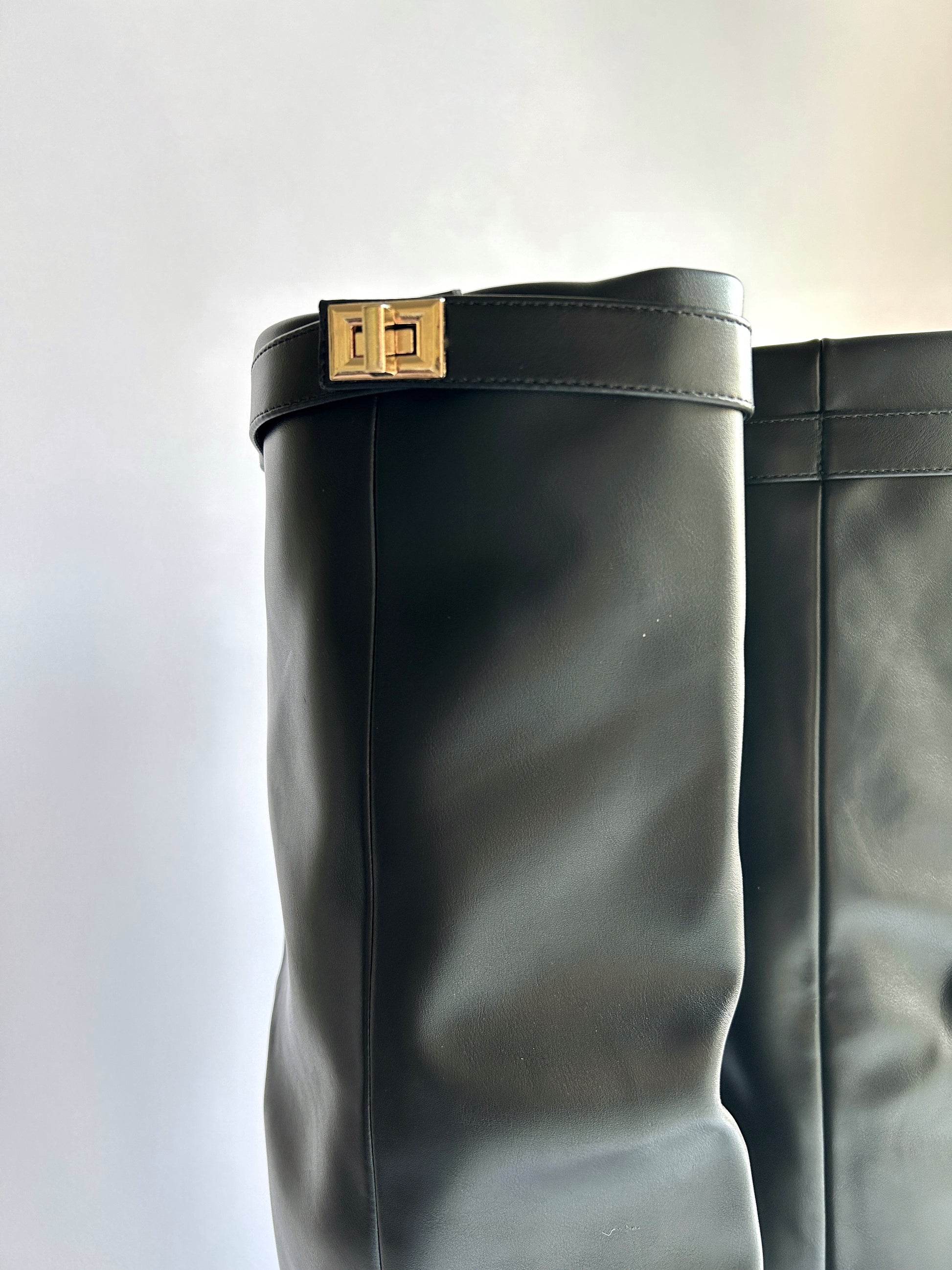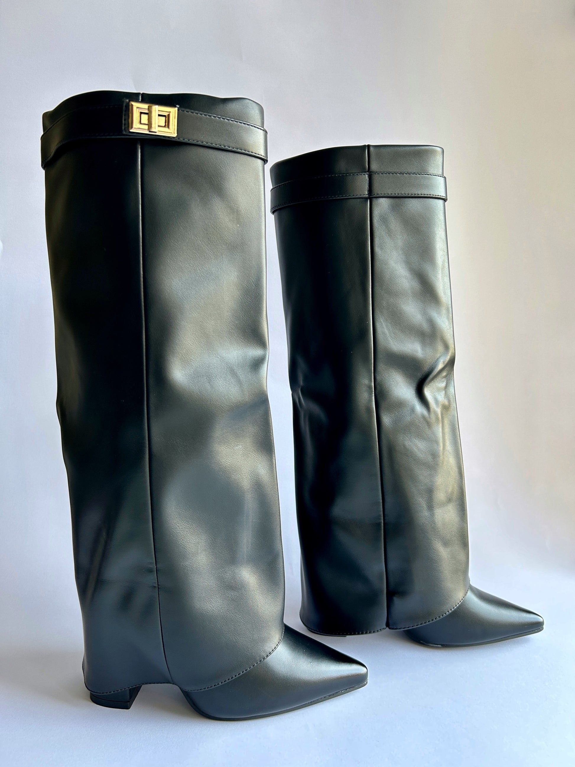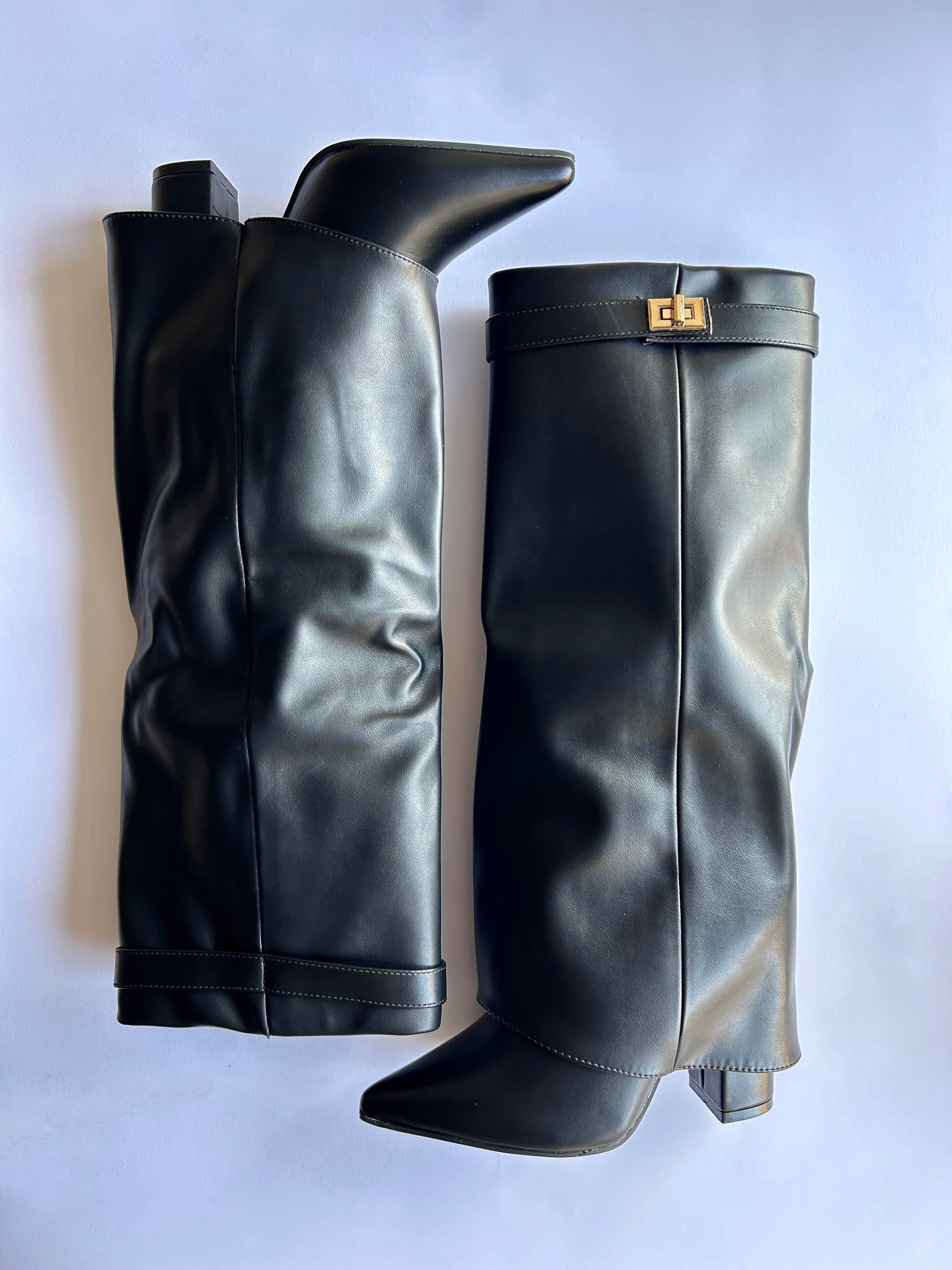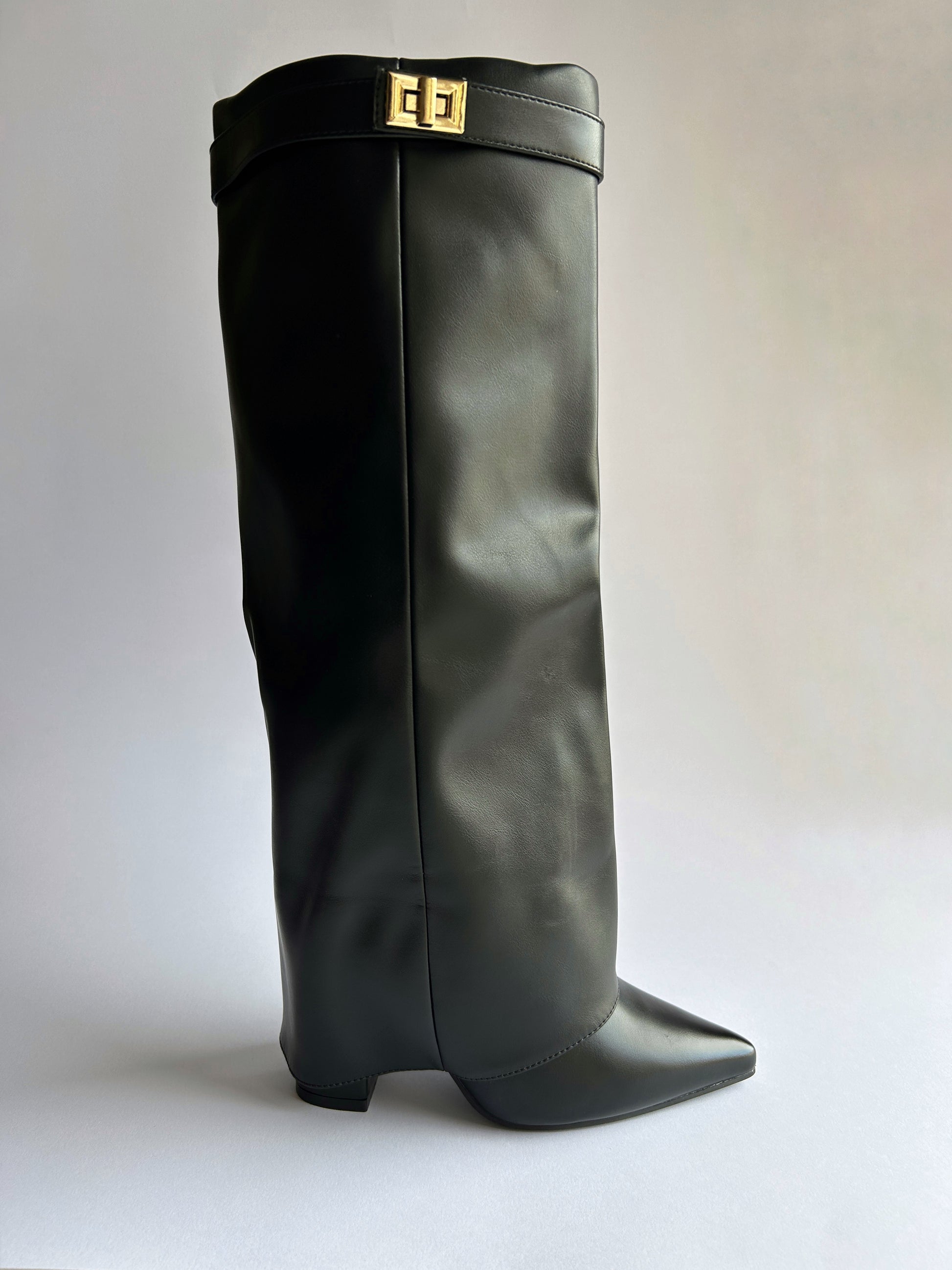 Stivali con tacco risvoltati con zip e dettaglio in oro.