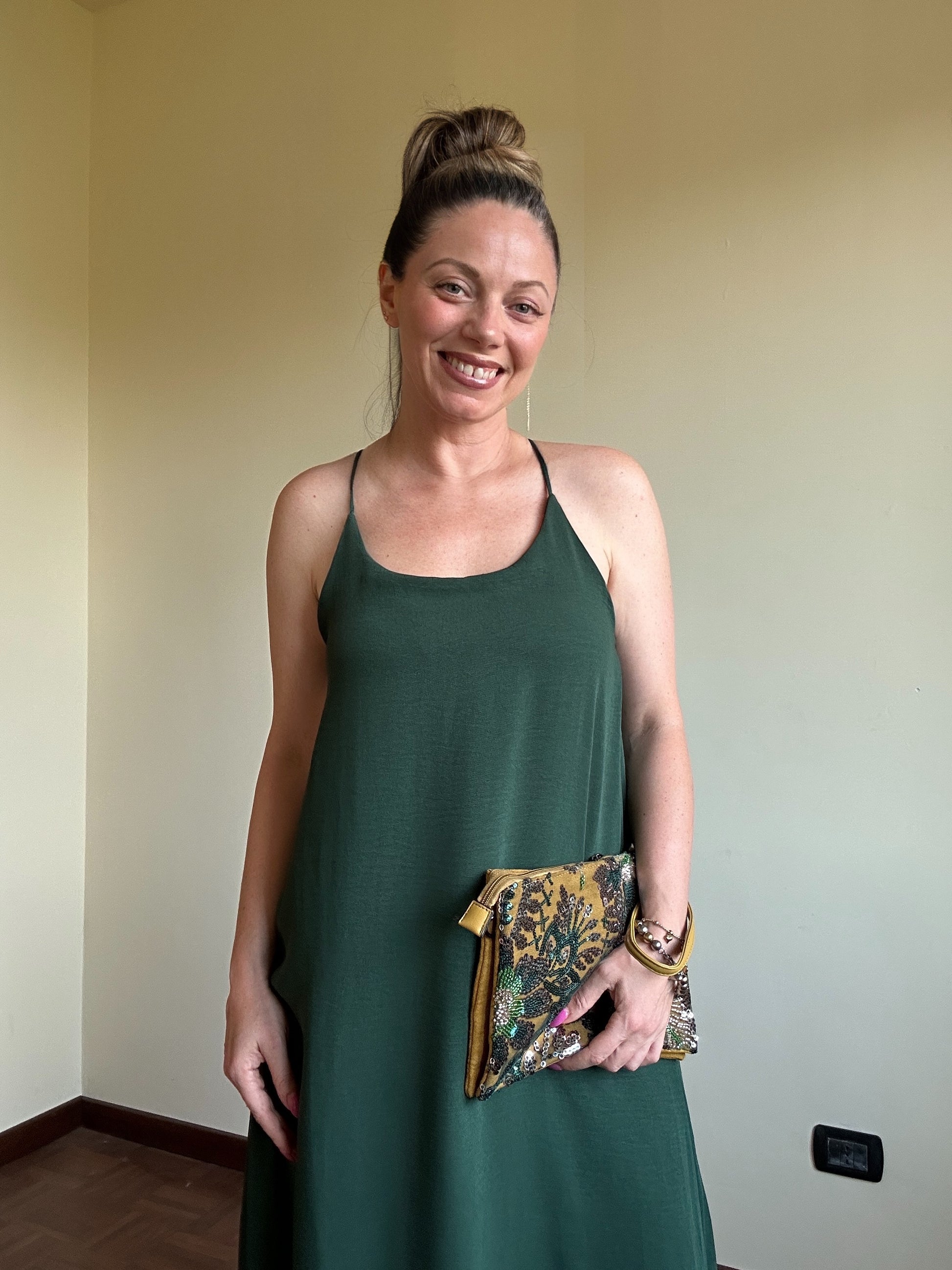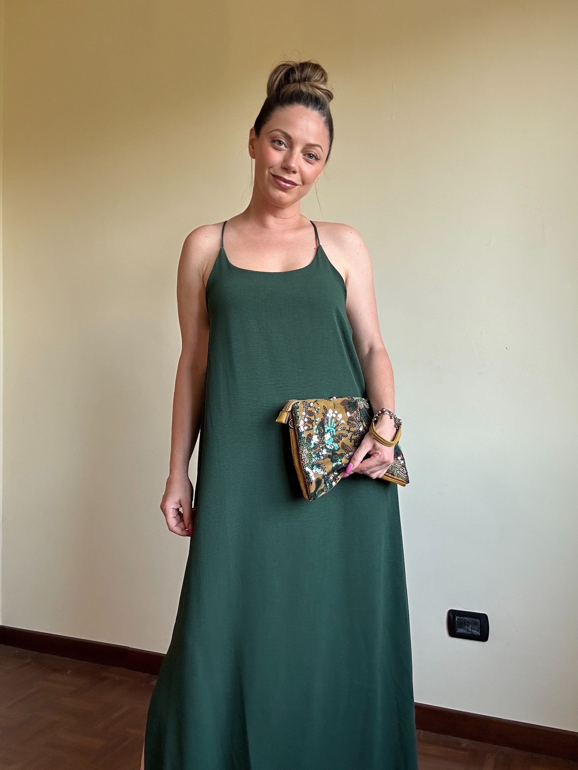 Meraviglioso abito lungo con spalline incrociate sulla schiena con elastico.