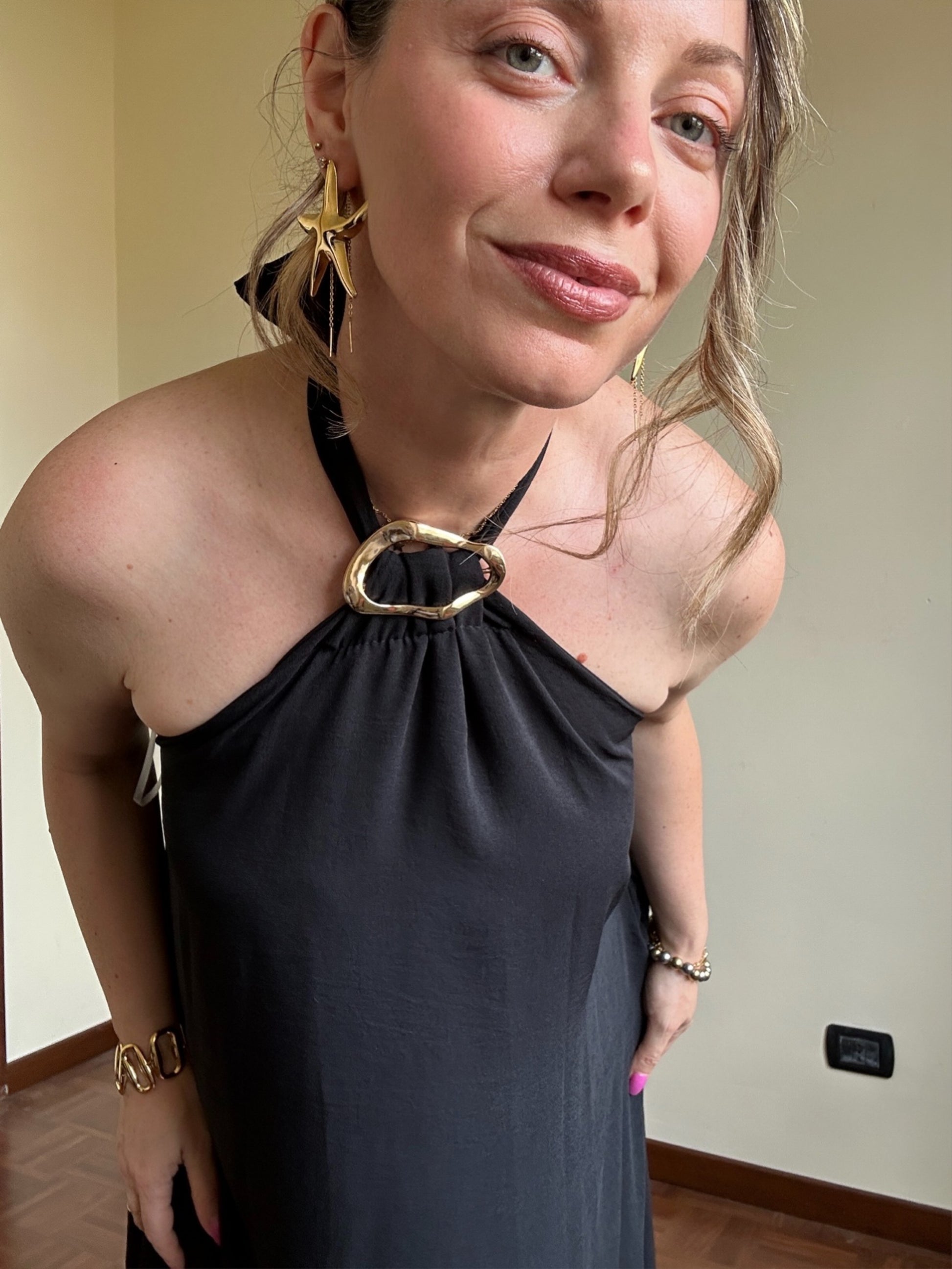 Bellissimo vestito nero lungo con applicazione in oro davanti, si allaccia dietro al collo.