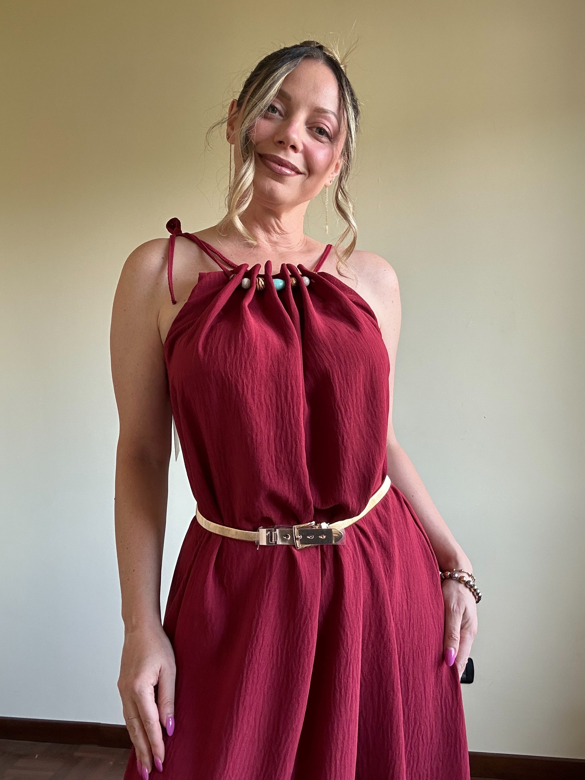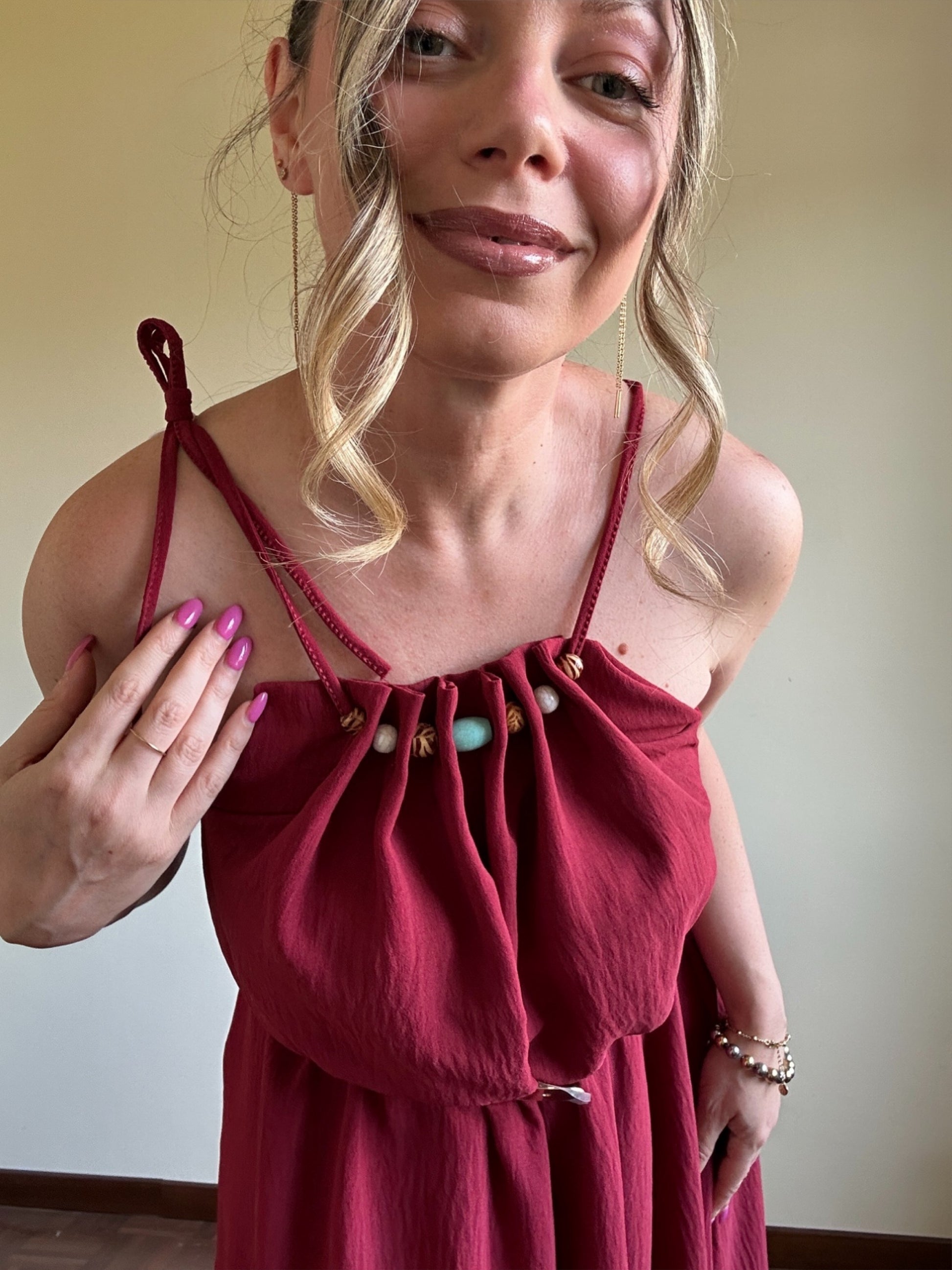 Arricciatura sul davanti con pietre colorate e bretelline regolabili.