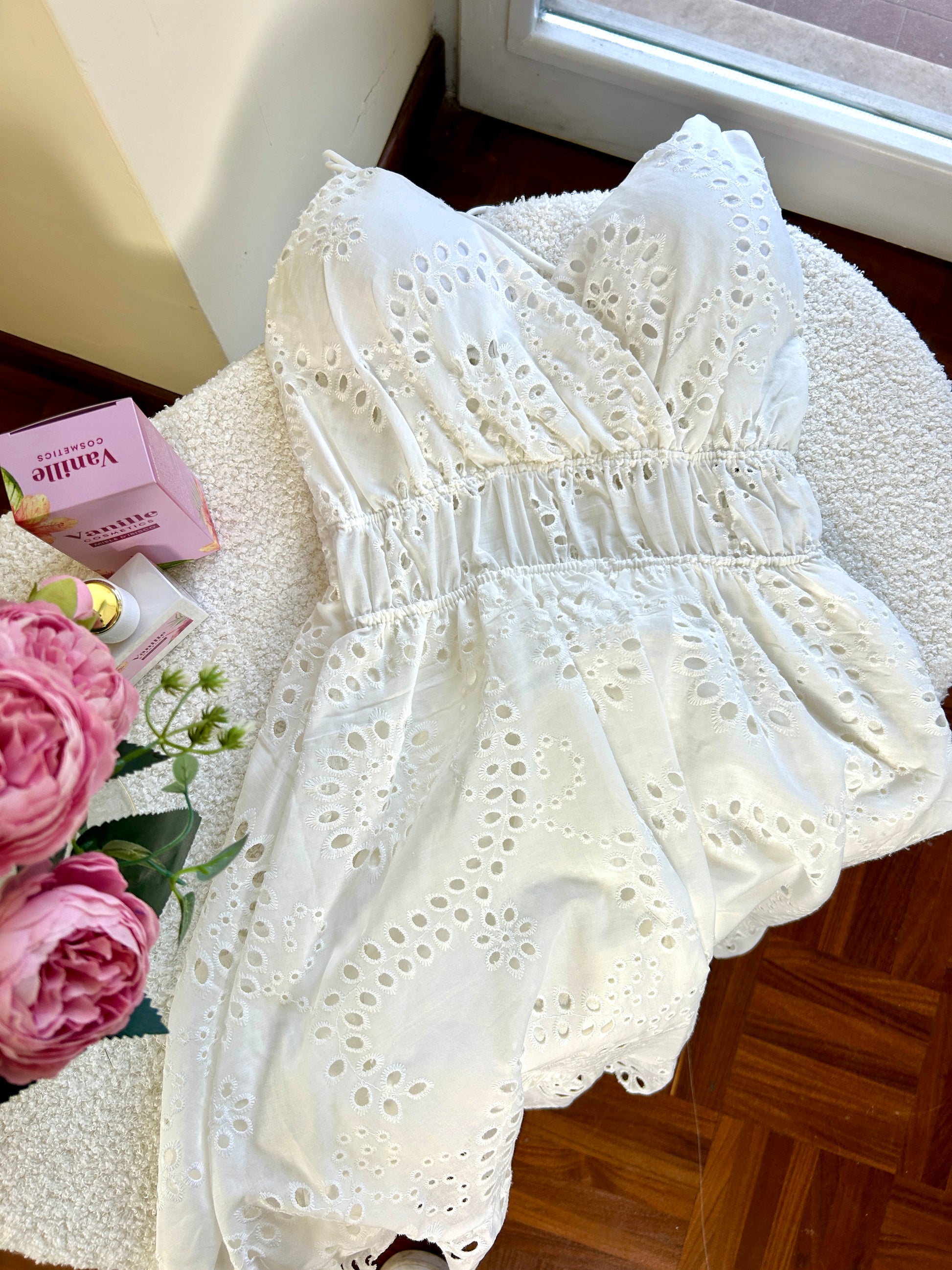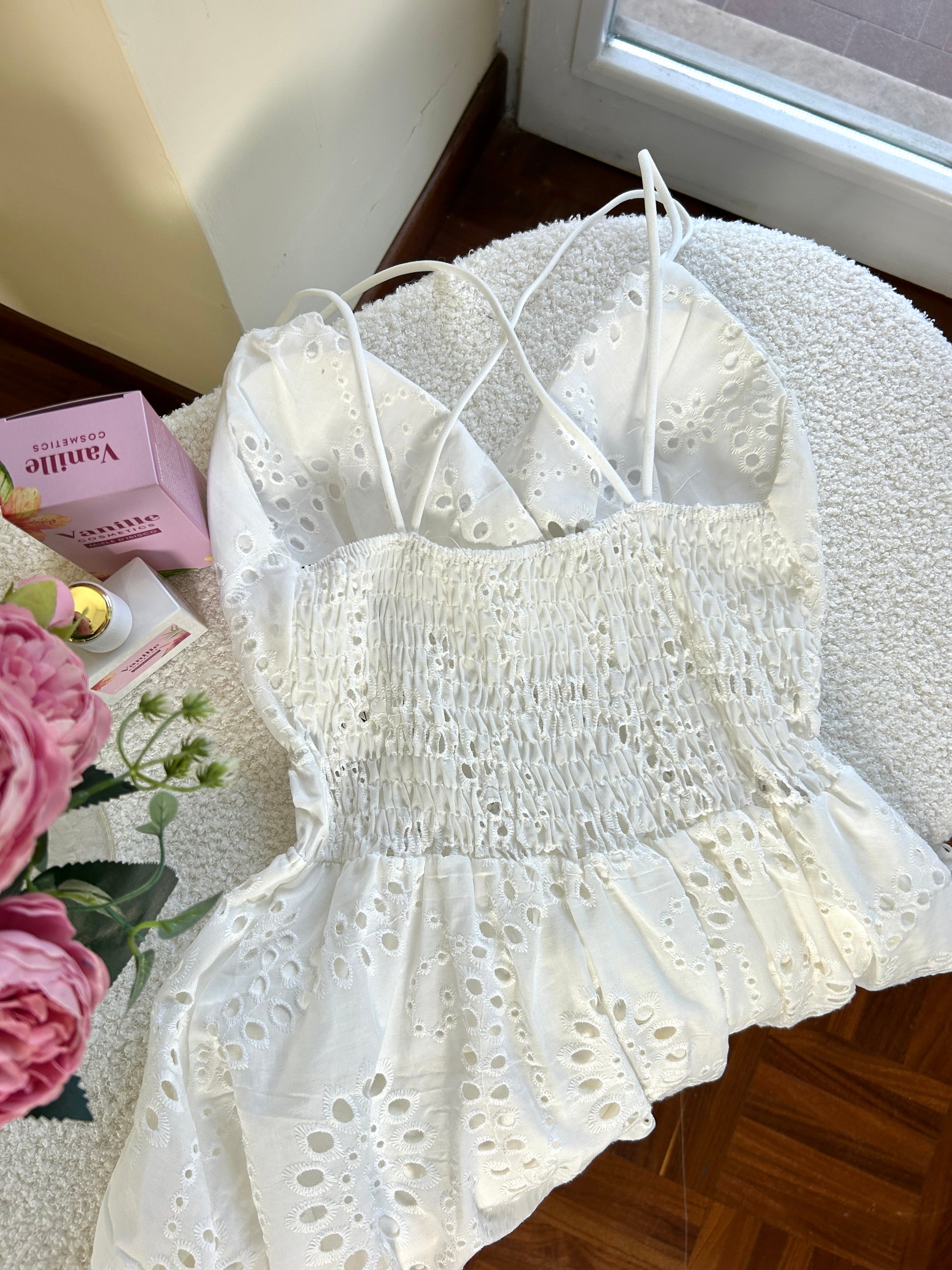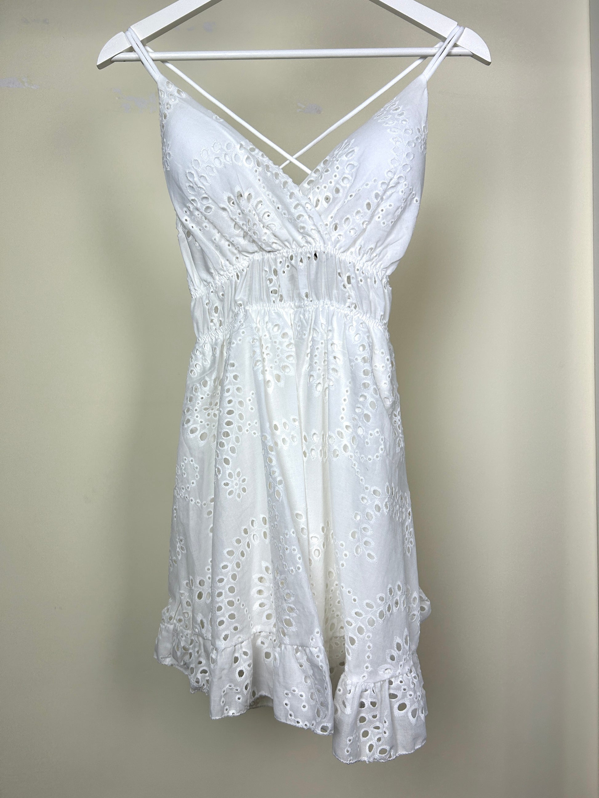 Vestito in pizzo con spalline incrociate sulla schiena e coppe preformate.